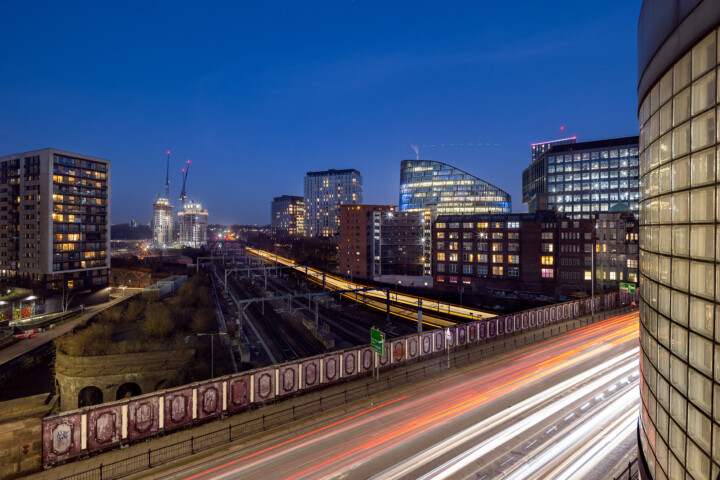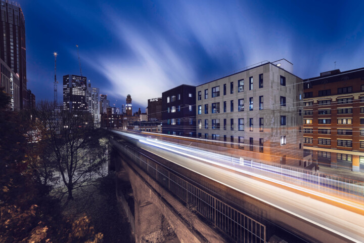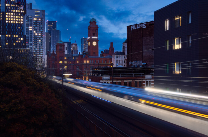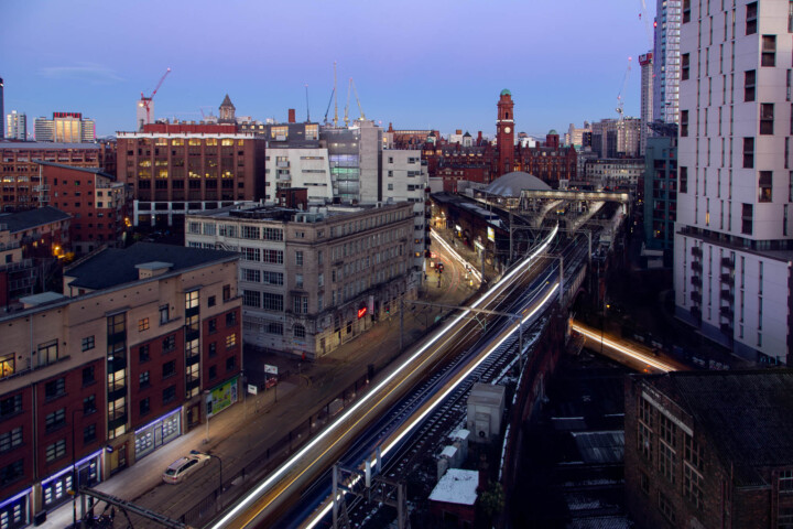 The NCP Manchester Charles Street Car Park offers the perfect setting for capturing light trails from the city’s passing trains. As the evening deepens, the passenger carriage lights create a spectacular play of colors against the city backdrop, a sight that’s a treat for the eyes and the camera lens.