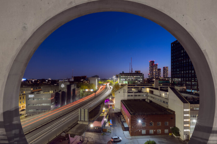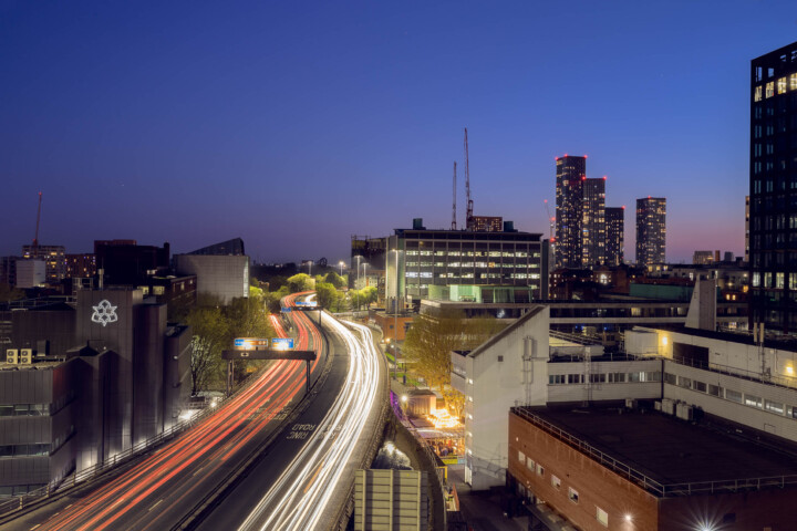 The NCP Circle Square is not just another carpark; it’s a window to Manchester’s architectural evolution. From here, you can catch the Mancunian Way’s car lights as they speed by and the illuminated Deansgate Square towers. As darkness descends, this spot is perfect for long-exposure shots, capturing the essence of Manchester’s night.